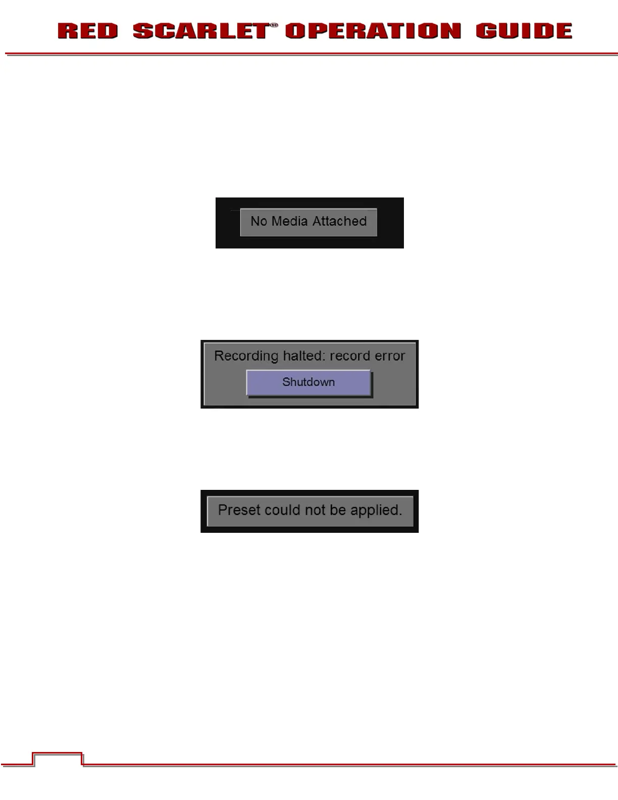 Displayed if media removed while recording. DO NOT remove media while camera is recording. Power