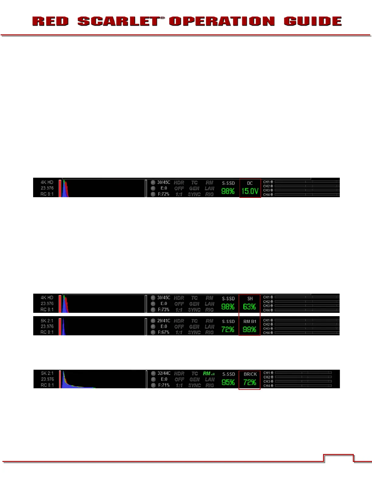 If using a REDVOLT battery in the Side Handle or Battery Module to power the camera, power status