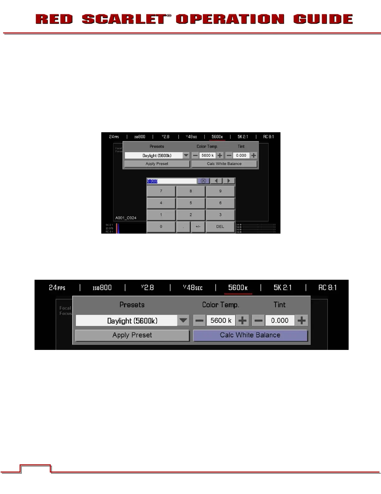 NOTE: Selecting Calc White Balance calculates a new Tint value. This is maintained if the Color Temp is