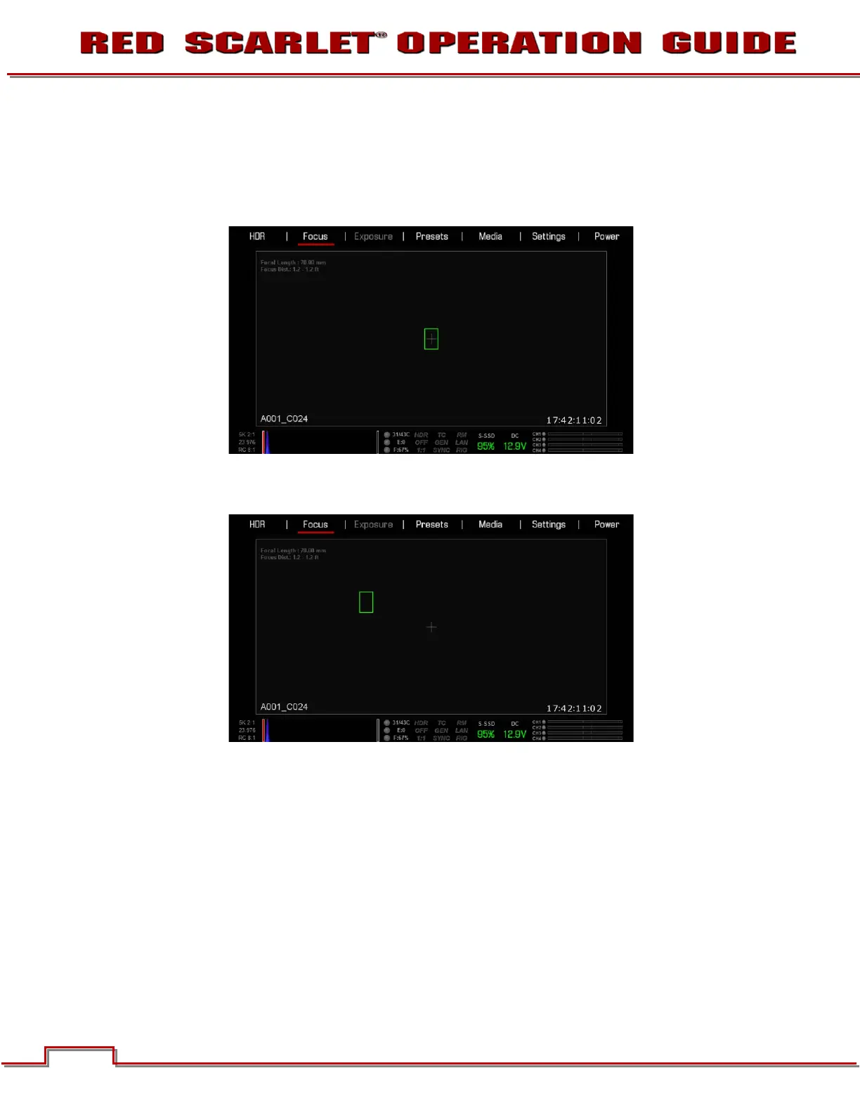 3. The spot focus square line weight will increase and the Red cursor under FOCUS will dim slightly.