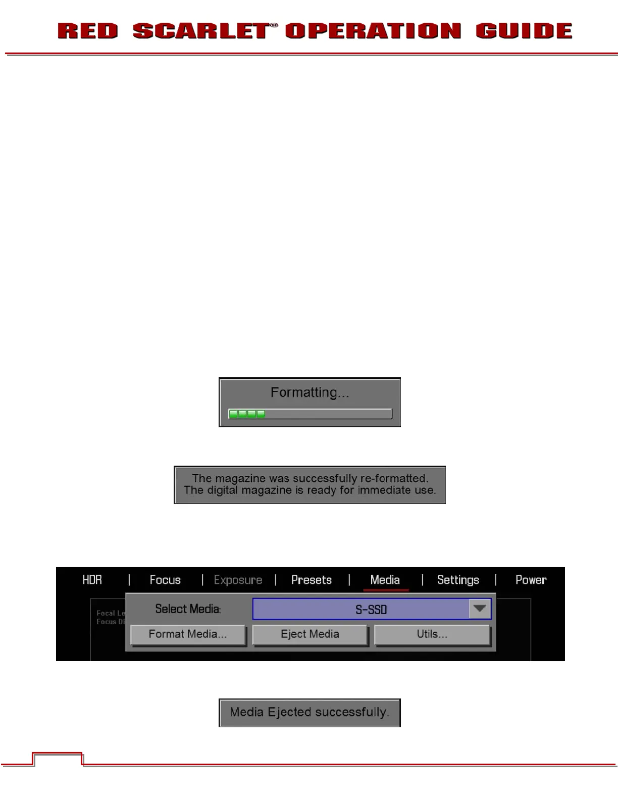 • During formatting, the camera will display “Formatting” with a Green status bar. REDMOTE will also