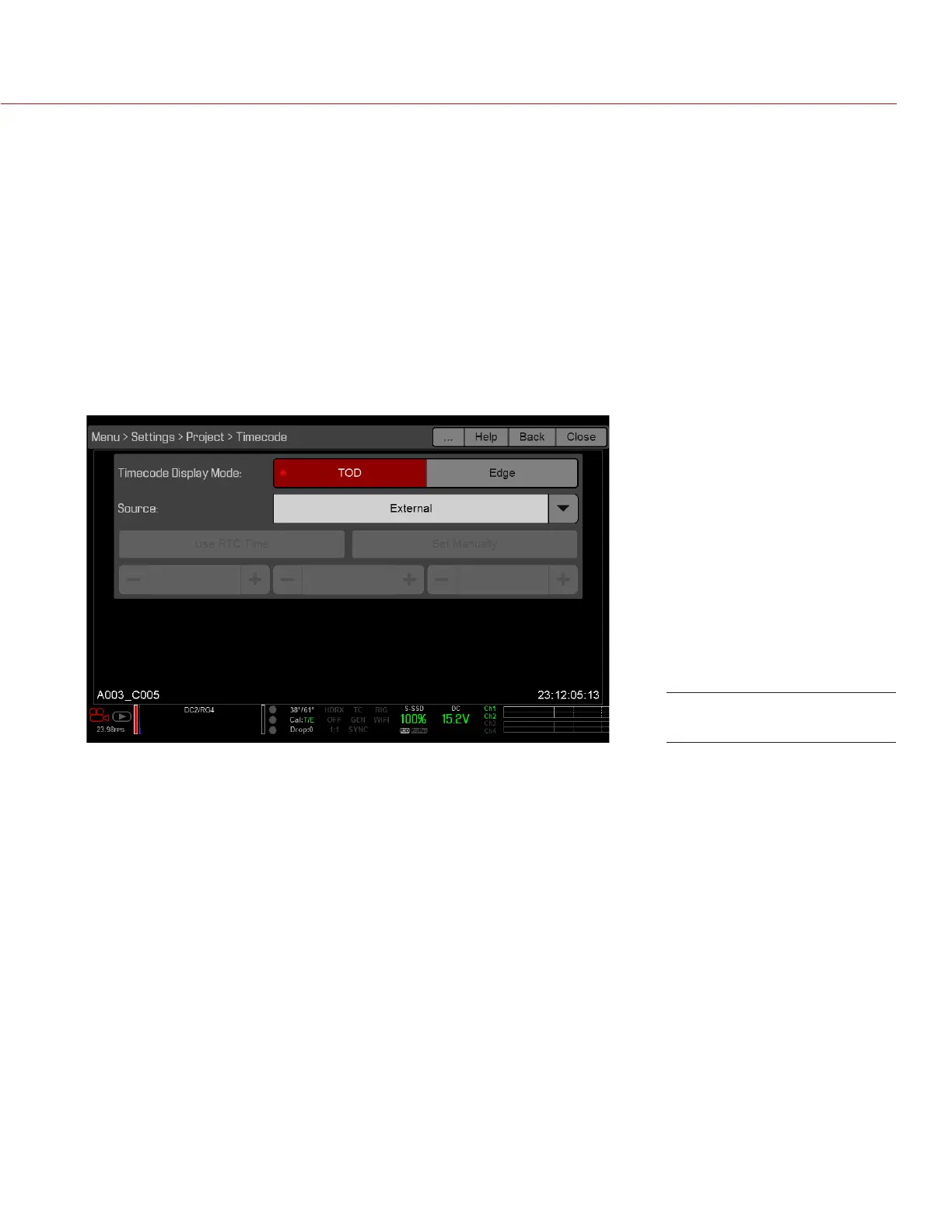 NOTE: When an external source is selected but not present, timecode displays User Provided settings.