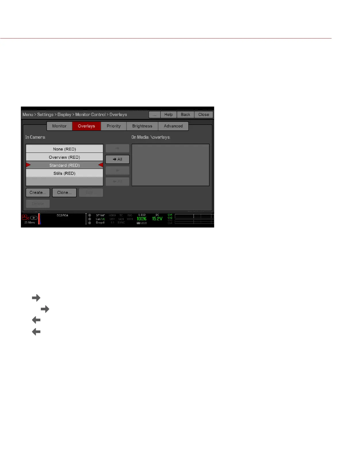 Camera: Overlays saved internally on the camera display in the Overlay drop-down menu on the Monitor