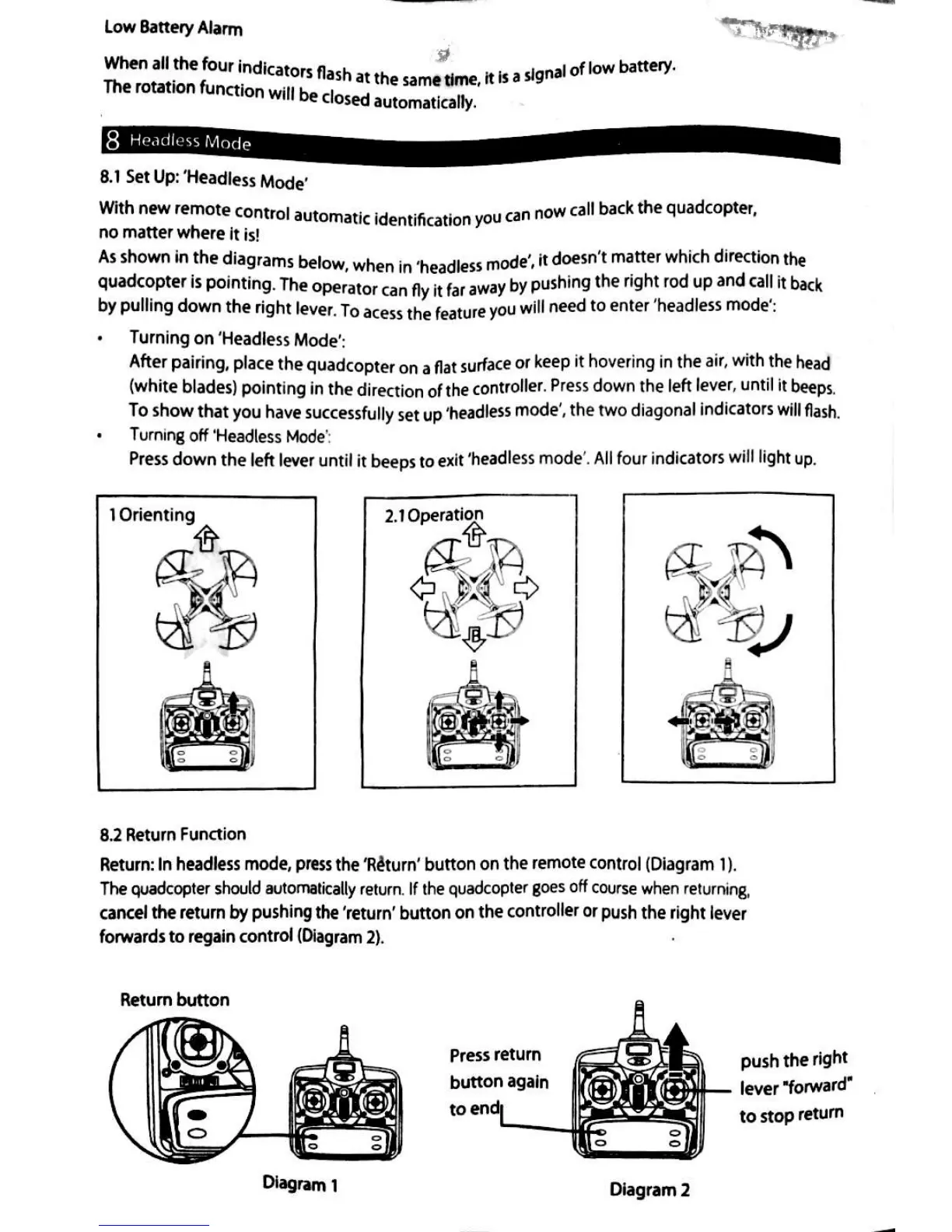 RED5 Sky Drone Pro V2 - Special Modes and Functions; Headless Mode; Return Function
