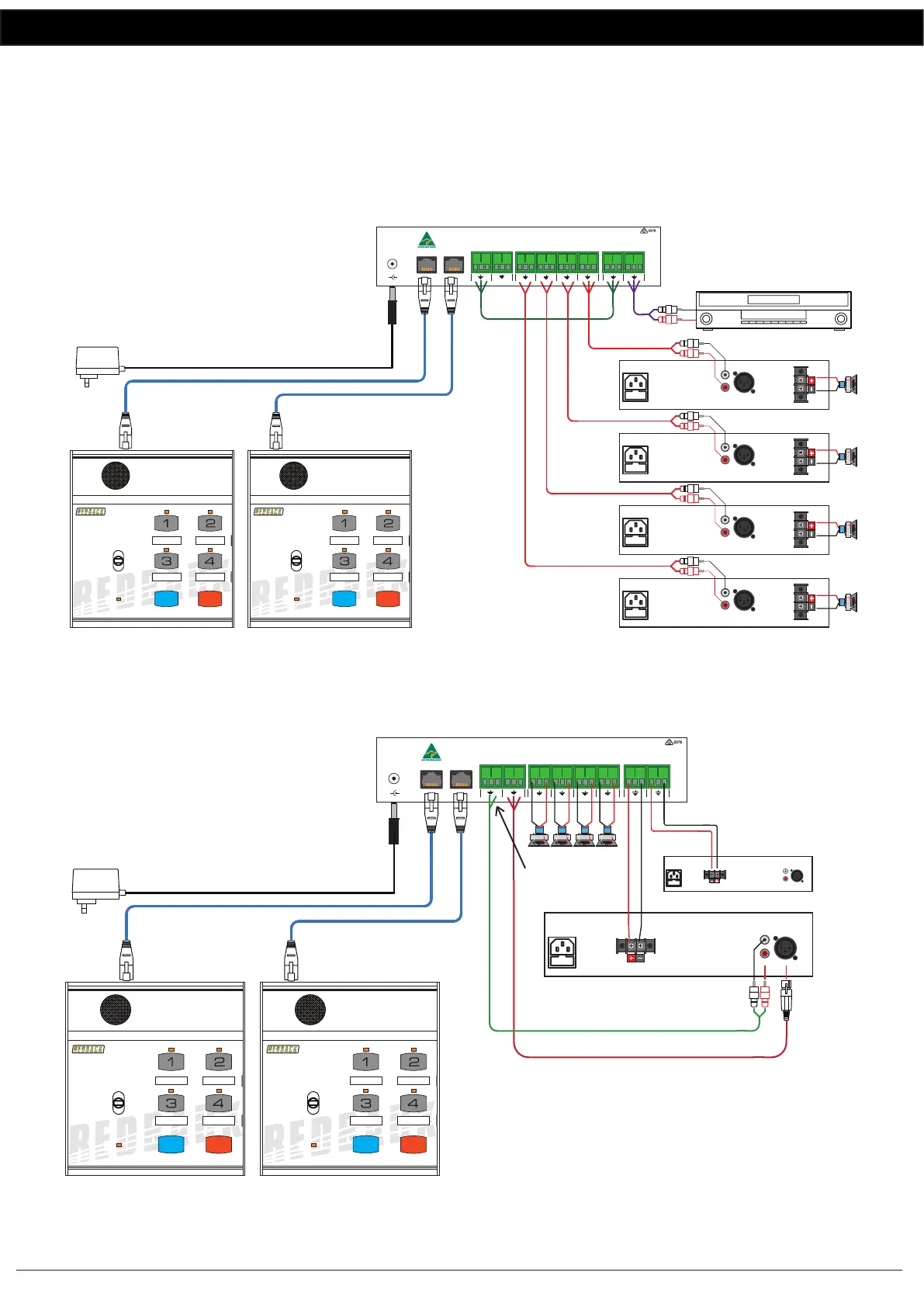 Use this method if using ampliers with Line level balanced inputs. If the ampliers used have mic level inputs use the
