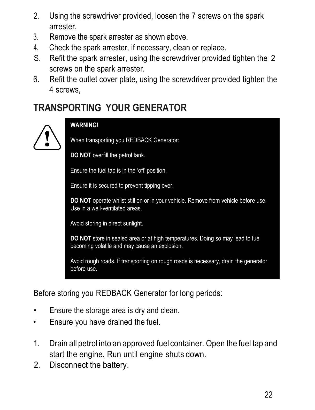 S. Refit the spark arrester, using the screwdriver provided tighten the 2