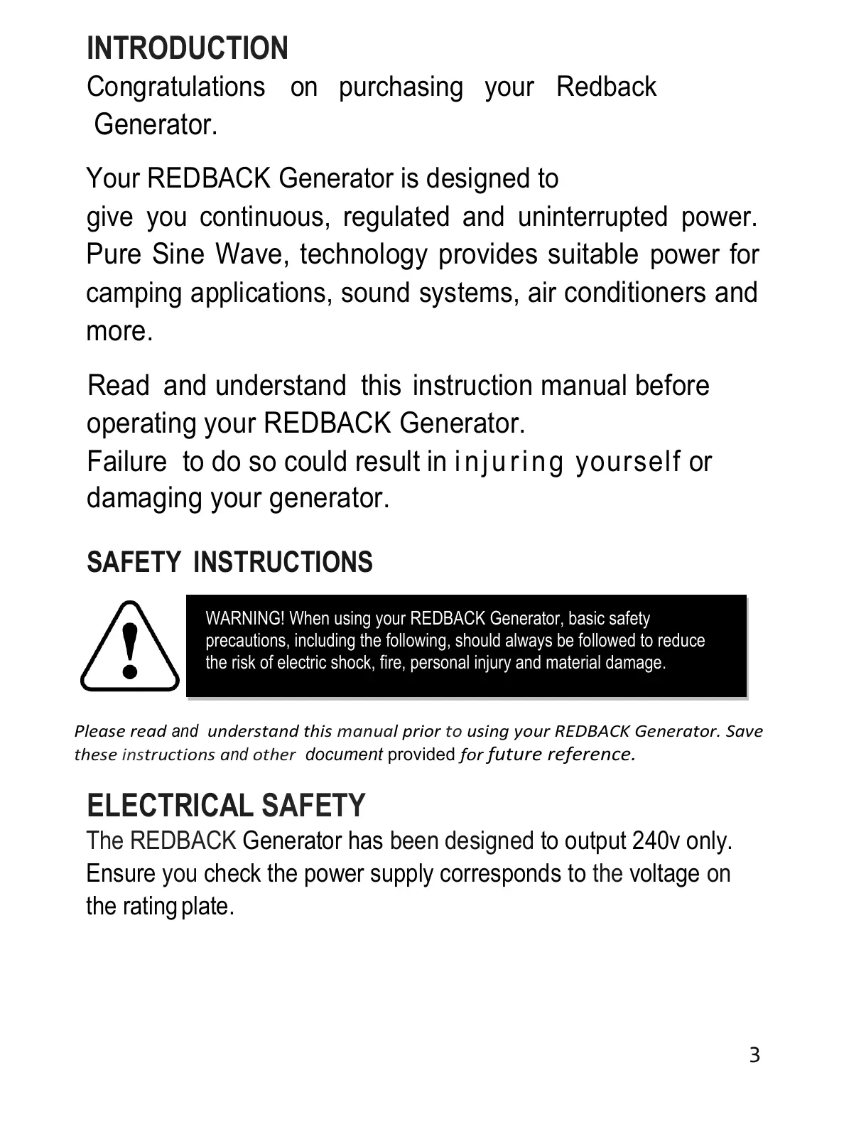 understand this manual prior to using your REDBACK Generator. Save