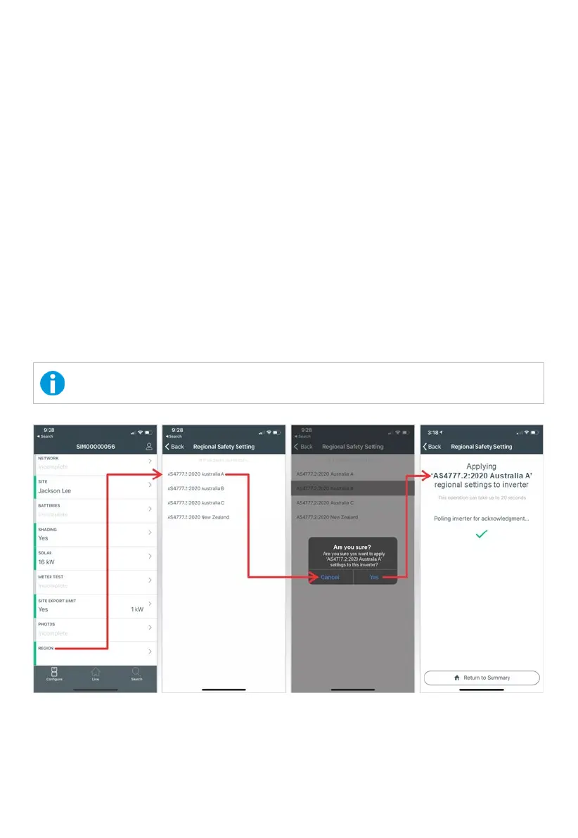 For convenience the Regional Safety Settings are set by selecting the Region from the list provided in the RedbackINSTALL app.