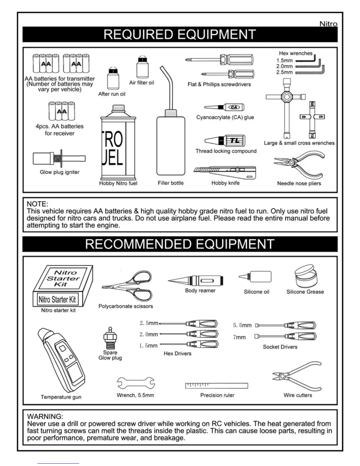 Redcat Racing s30 - Required and Recommended Equipment; Essential Equipment List; Recommended Tools for Setup