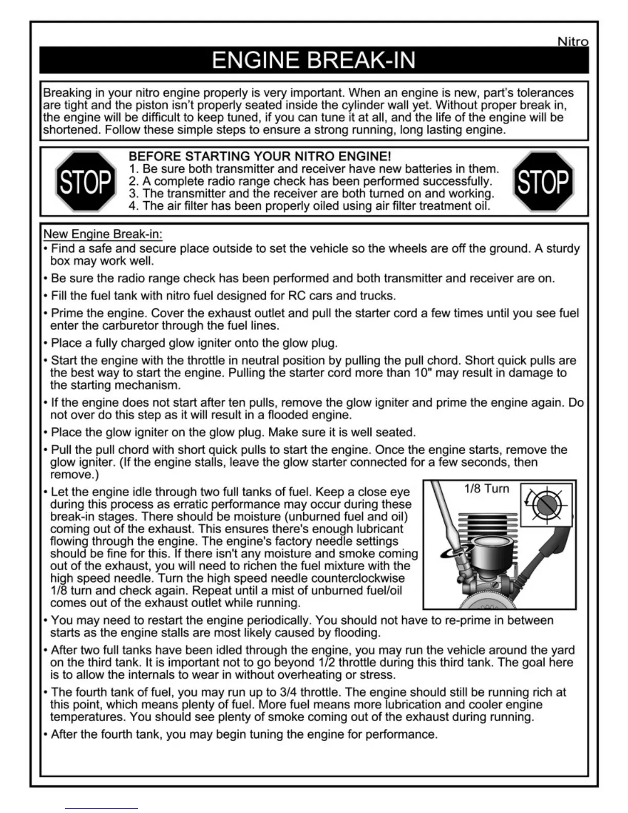 Redcat Racing s30 - Engine Break-In Procedure; Pre-Break-In Checks; Break-In Running Steps