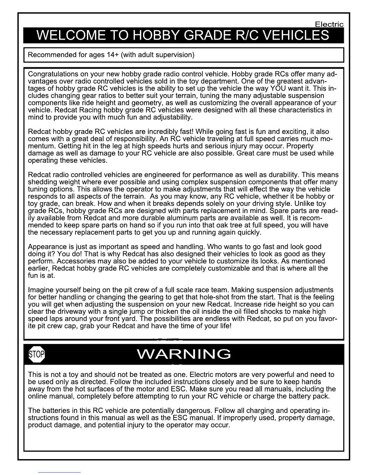 Congratulations on your new hobby grade radio control vehicle. Hobby grade RCs offer many ad-