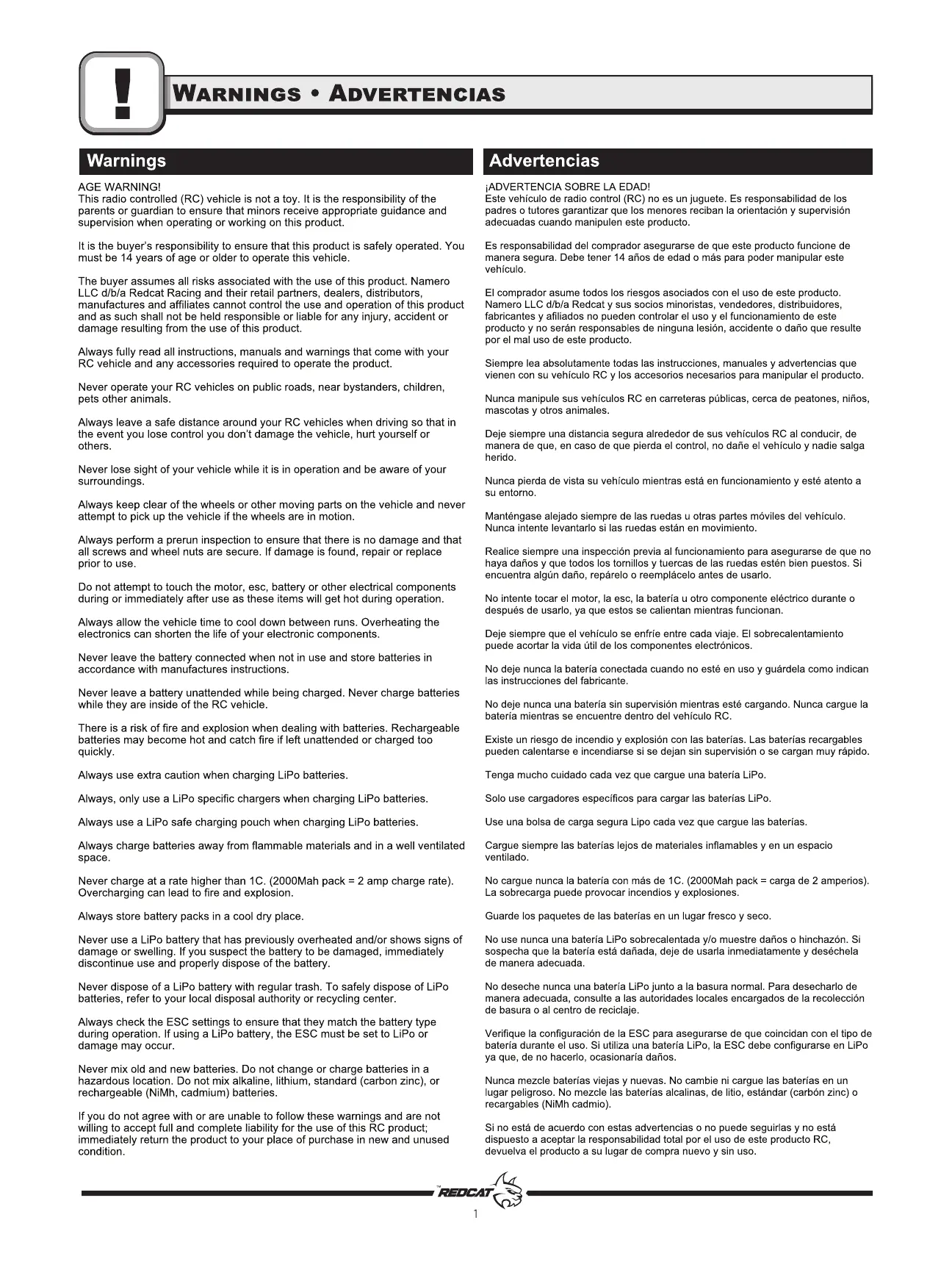 REDCAT GEN9 - RC Vehicle Safety Warnings; Age Limit and Operator Responsibility; Safe Operation Guidelines; LiPo Battery Safety and Handling