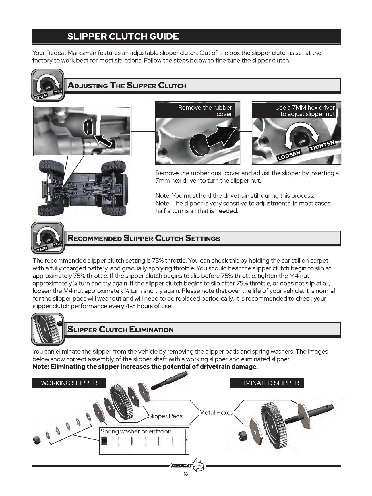 REDCAT Marksman - SLIPPER CLUTCH GUIDE; ADJUSTING THE SLIPPER CLUTCH; RECOMMENDED SLIPPER CLUTCH SETTINGS; SLIPPER CLUTCH ELIMINATION