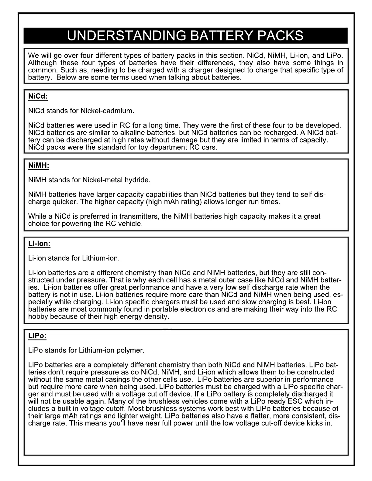 We will go over four different types of battery packs in this section. NiCd, NiMH, Li-ion, and LiPo.