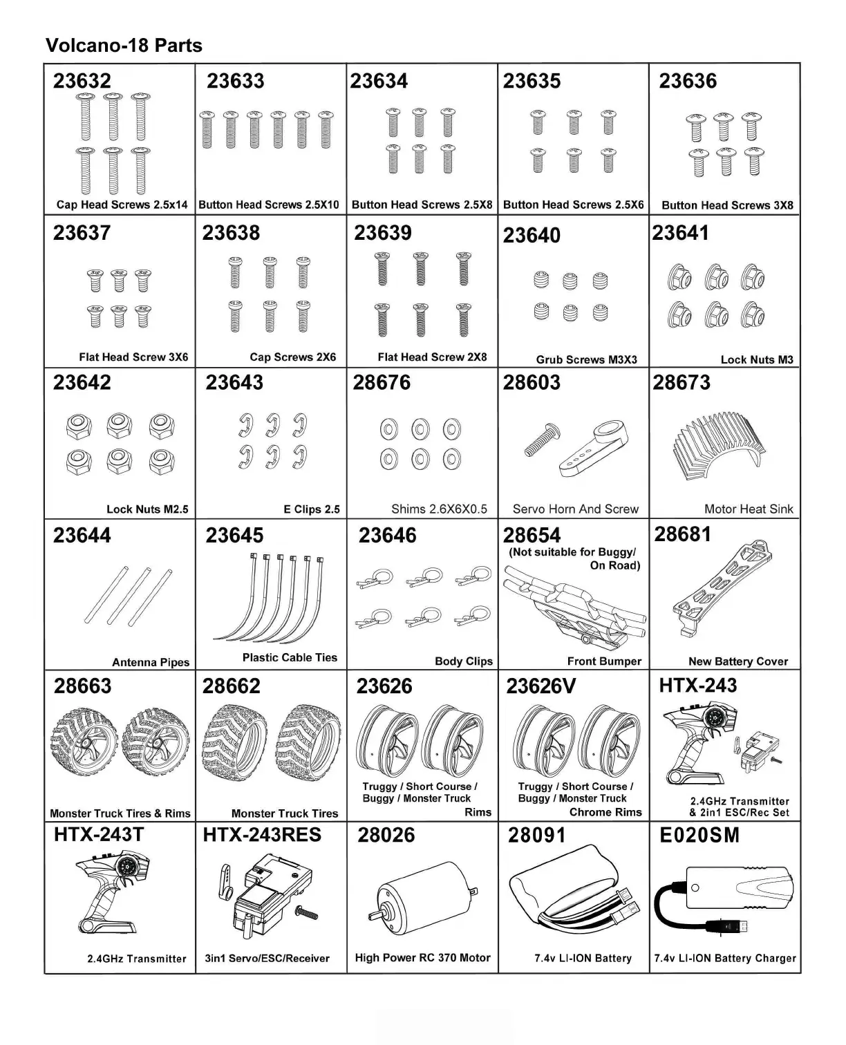 REDCAT Volcano 18 - Volcano-18 Parts (Continued); Fasteners and Small Components; Electronics and Tires