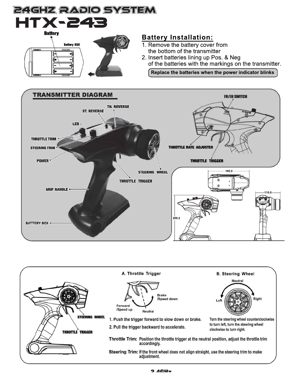 REDCAT Volcano 18 - 2.4 GHz Radio System HTX-243; Transmitter Diagram and Controls; Transmitter Battery Installation; Throttle and Steering Operation