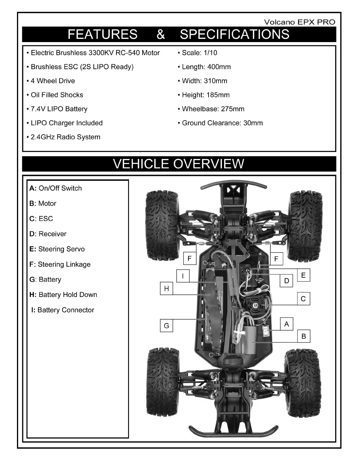 REDCAT Volcano EPX PRO - Vehicle Features and Specifications; Key Features; Technical Specifications; Vehicle Overview