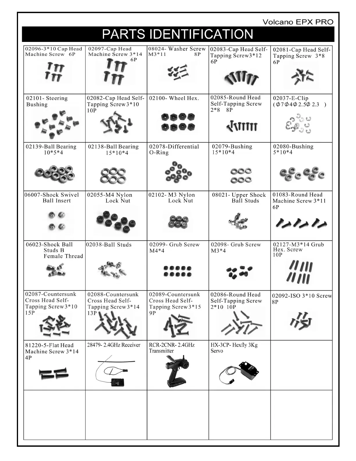 REDCAT Volcano EPX PRO - Parts Identification (Fasteners); Screws and Fasteners; Bearings, Bushings, and Clips; Shock and Radio Components