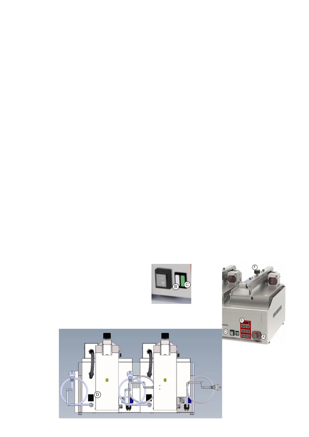 Schalten Sie mit dem Hauptschalter (D), die Anzeigeleuchte (C) zeigt das Einschalten des Gerätes