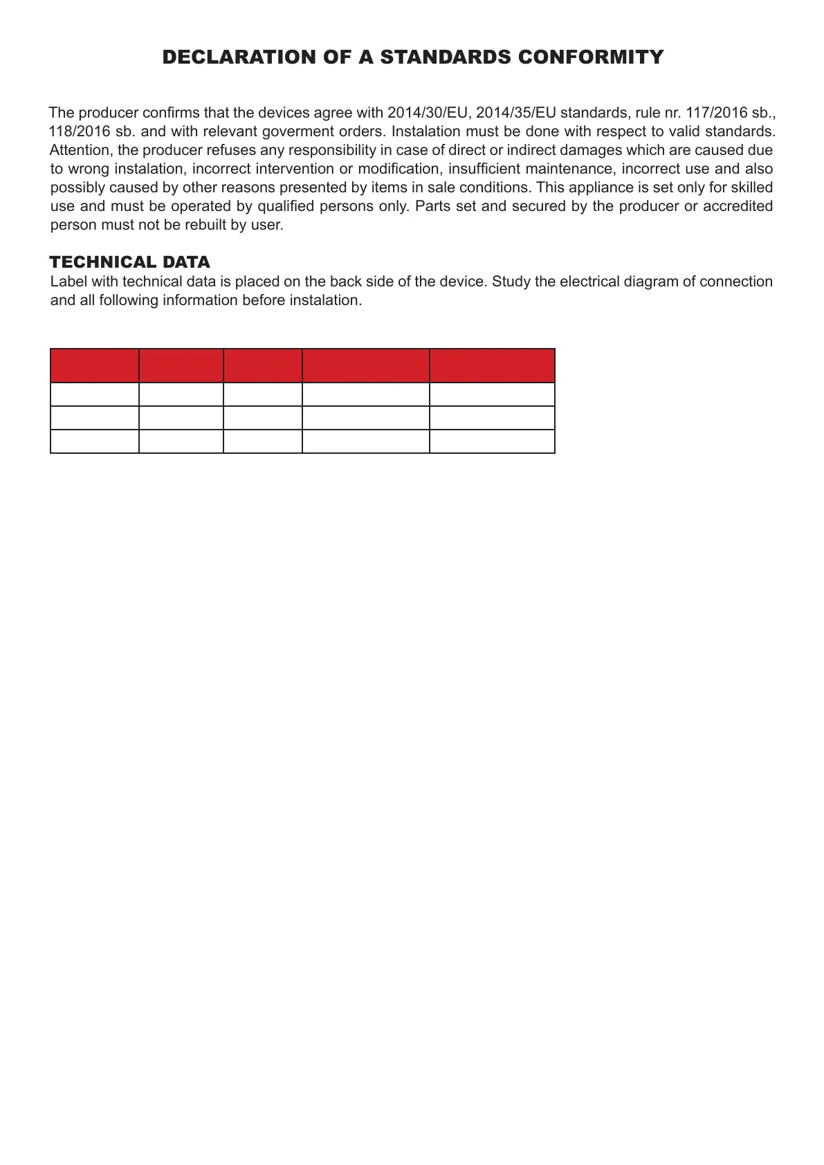 The producer confi rms that the devices agree with 2014/30/EU, 2014/35/EU standards, rule nr. 117/2016 sb.,