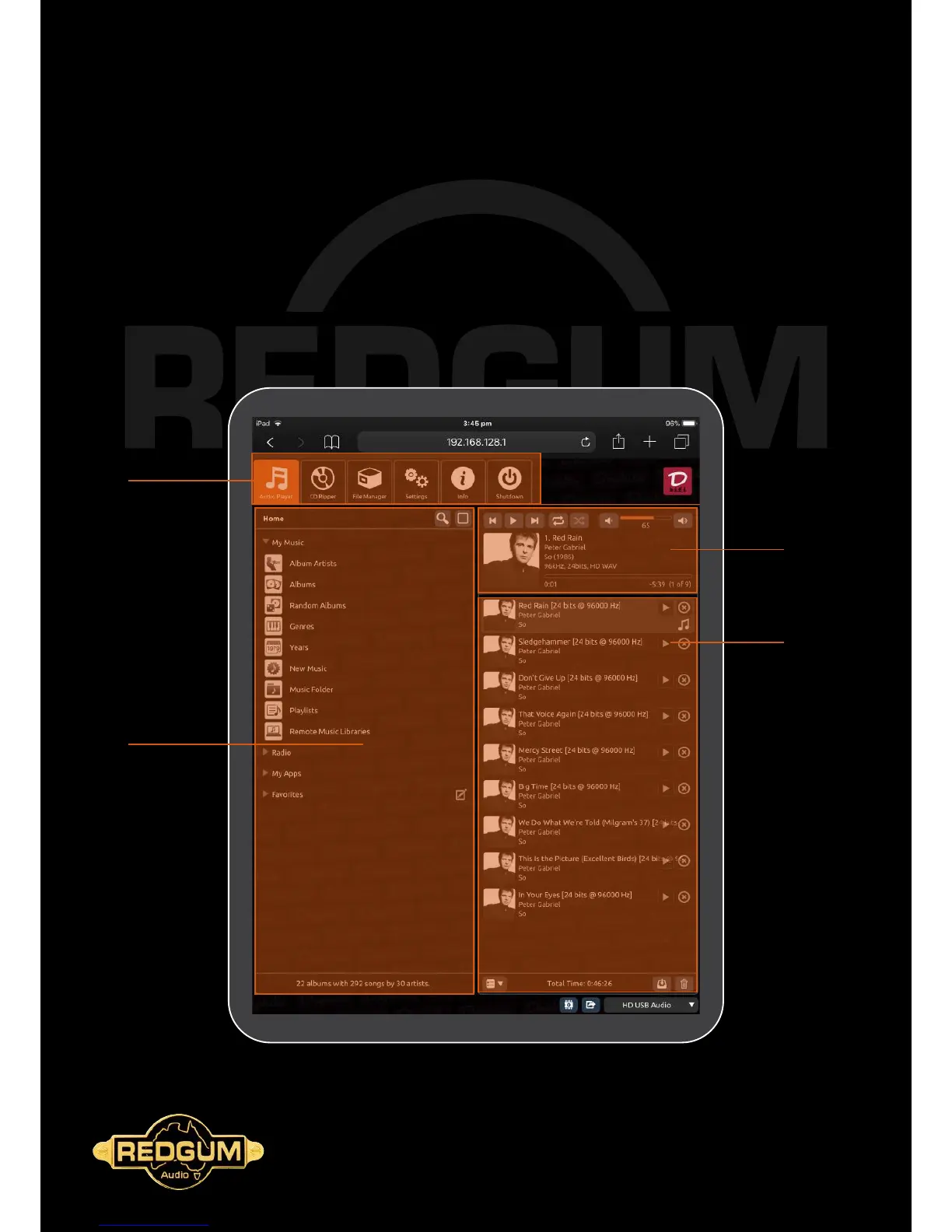 The Daphile interface is laid out as below for ease of use. Users will be familiar with most of the controls and features of the