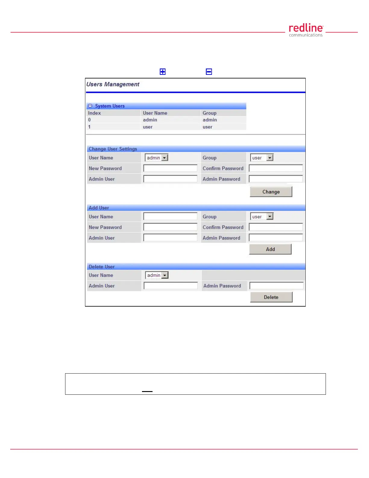 Administrators can add new user accounts and modify passwords. Usernames may be 1