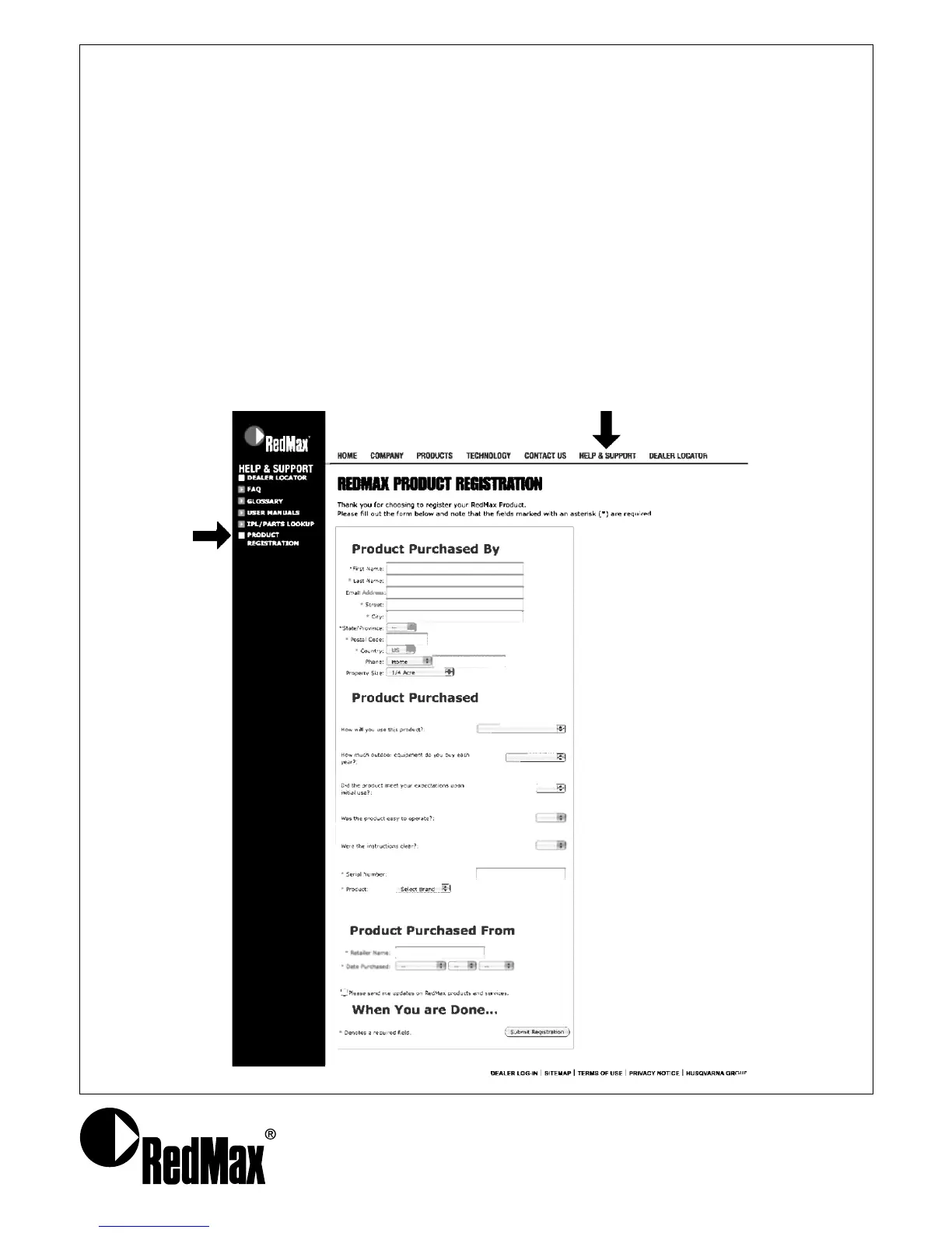 en línea sin importar su año modelo. Registre los productos en línea en www.redmax.com, chasque la Help & Support