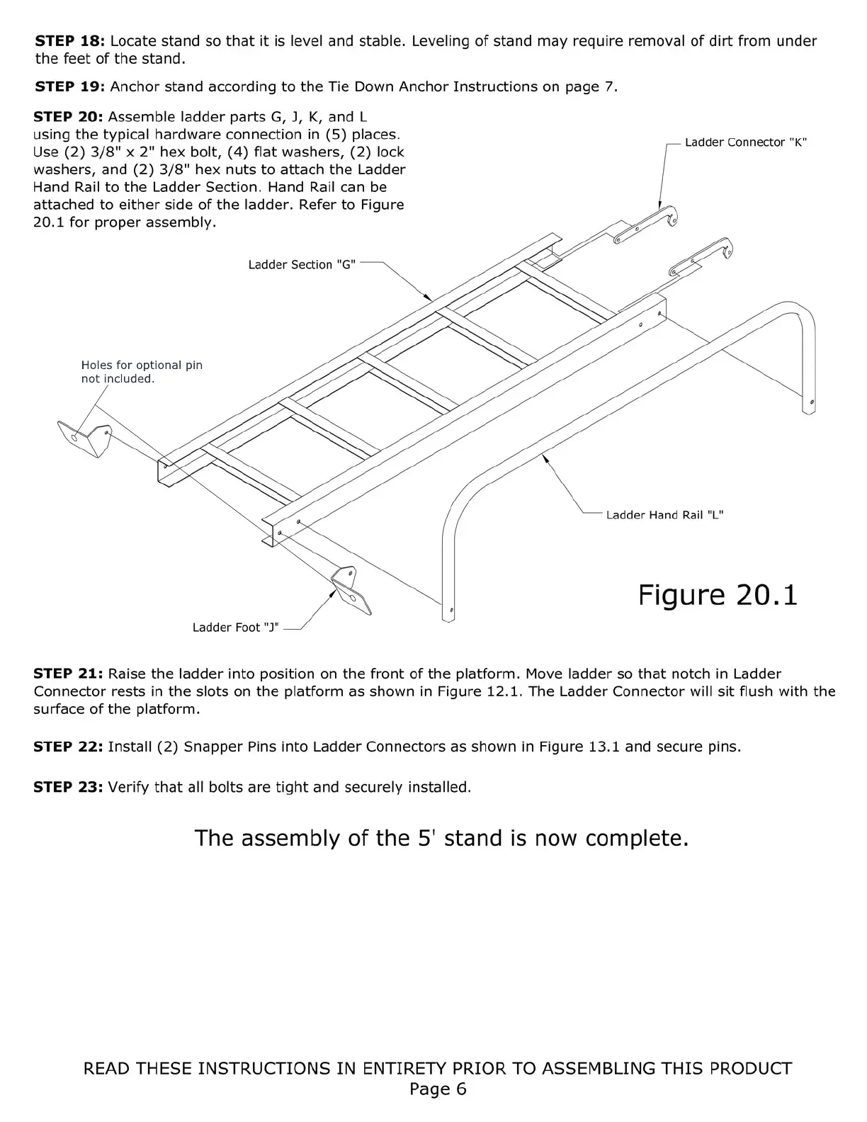RedNeck Deer - 5 Stand Configuration Assembly: Ladder and Final Checks; Step 18: Position and Level 5 Stand; Step 19: Anchor 5 Stand; Ladder Assembly and Attachment for 5 Stand
