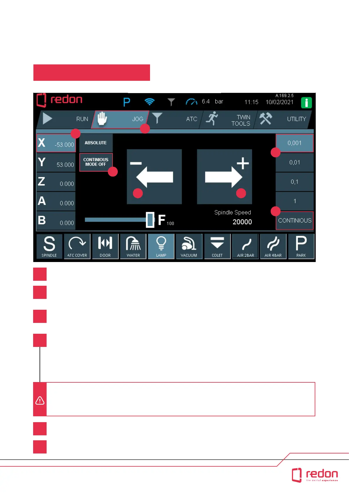 If you want to move the axes continuously, click the CONTINUOUS MODE OFF buon. The buon will now read