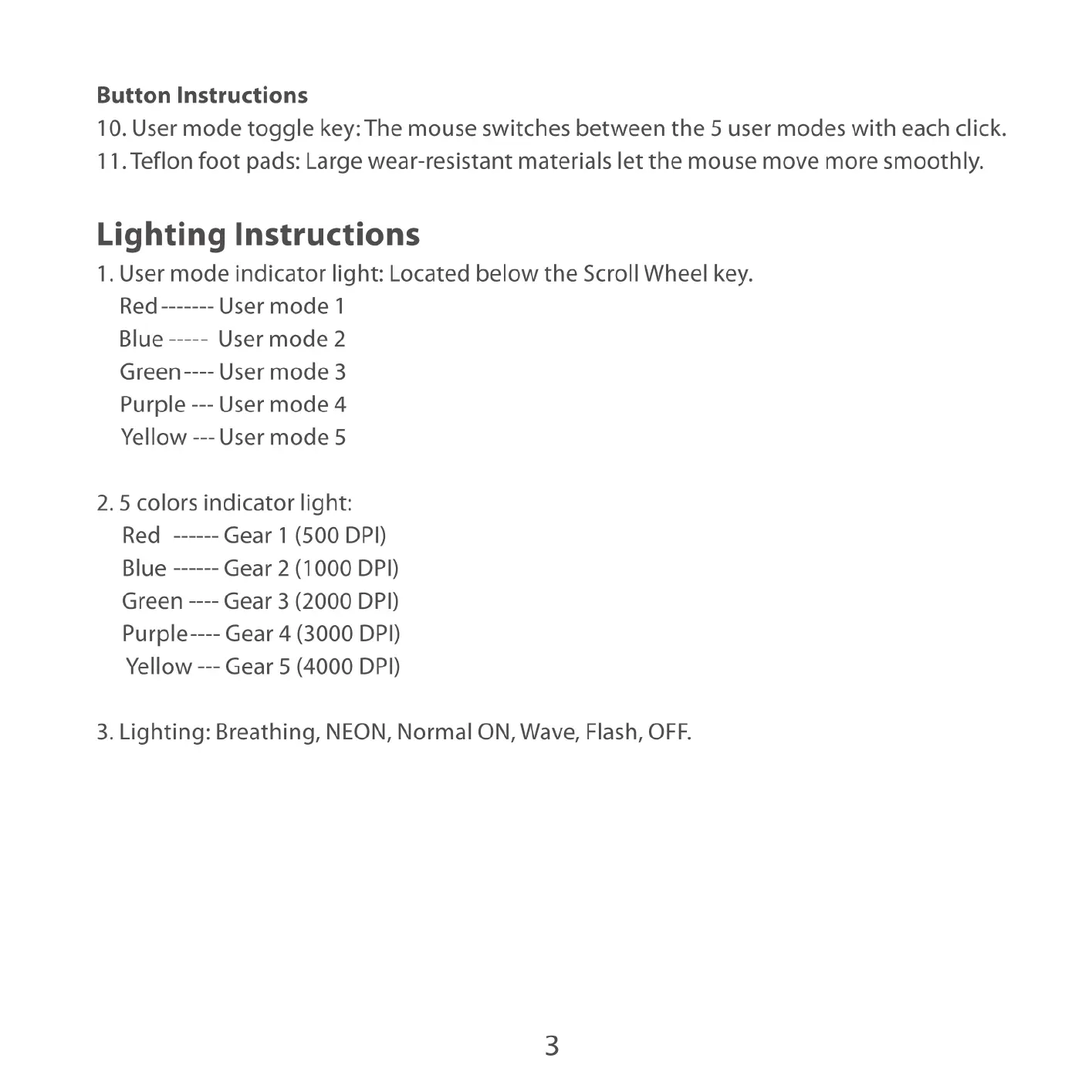 REDRAGON M910-K RANGER BASIC - Lighting and User Modes; Button Instructions (Continued); Lighting Instructions