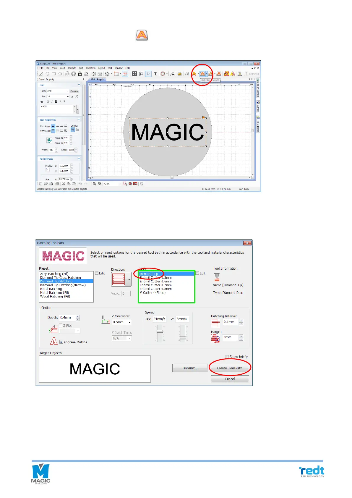 7. Select an engraving option and tool from “Hatching tool pathwindow and if necessary, designate gap and