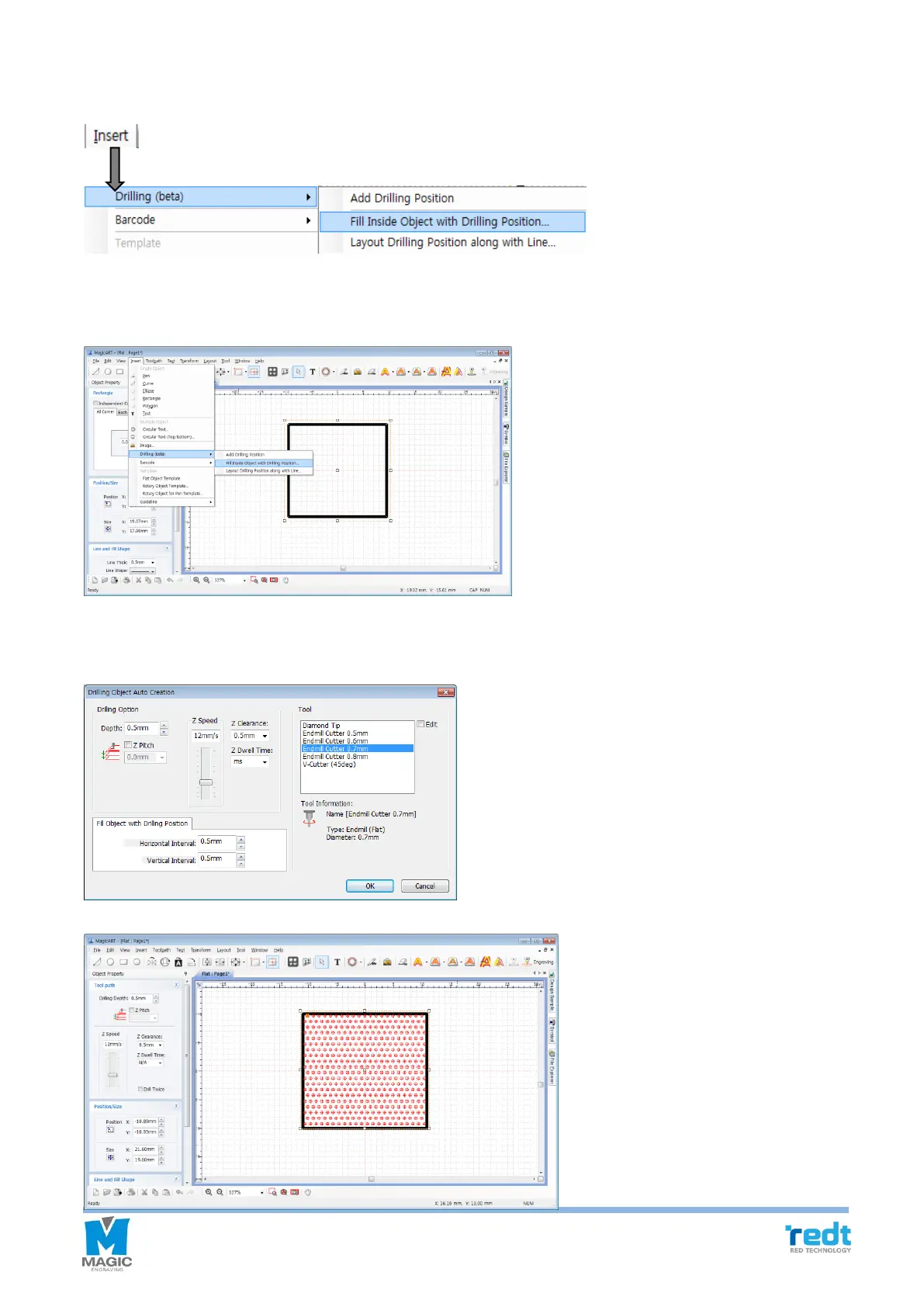 Select a shape to be filled with the drilled object. Click “Insert Drill Fill Inside Object with Drilling Position