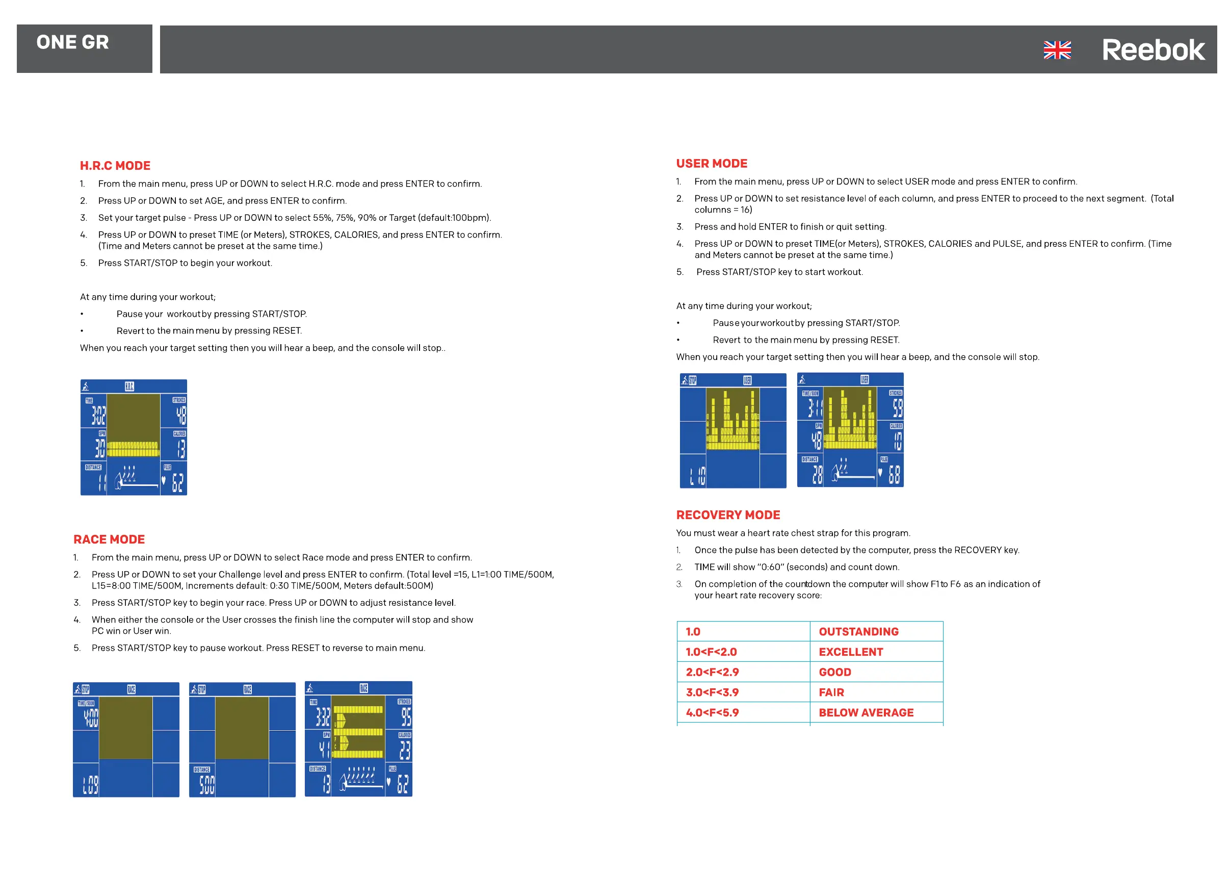 Reebok ONE GR - Specialized Workout Modes; H.R.C. Mode Setup; Race Mode Instructions; User Mode Configuration