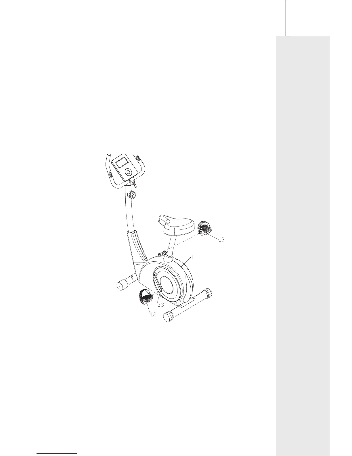 The right pedal is marked with R and should be threaded onto the crank (33)