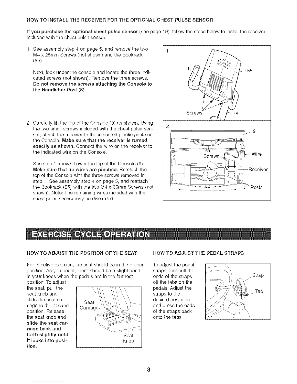 HOW TO INSTALL THE RECEmVER FOR THE OPTmONAL CHEST PULSE SENSOR