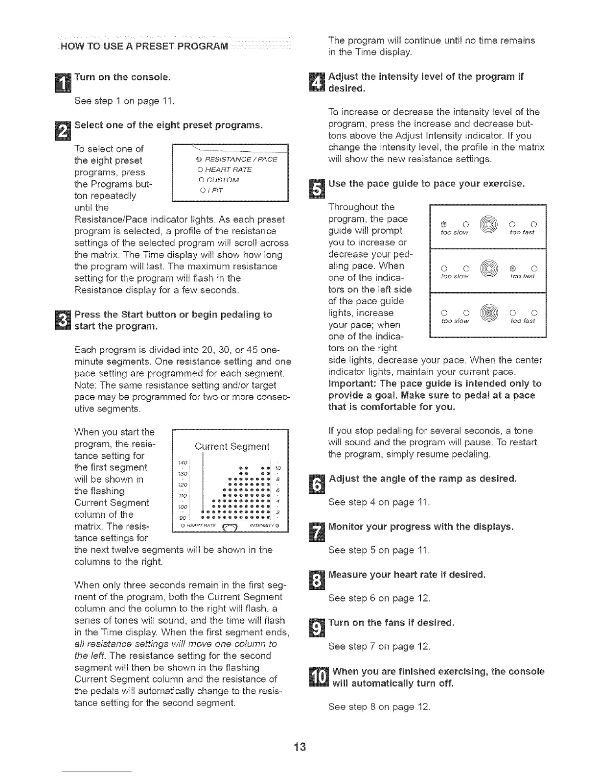 Resistance/Pace indicator lights. As each preset