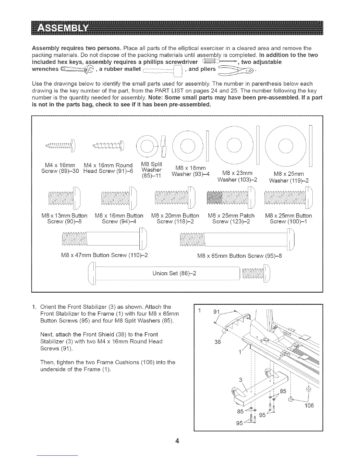 Assemblyrequirestwopersons.Placeallpartsoftheelliptical exerciser in a cleared area and remove the