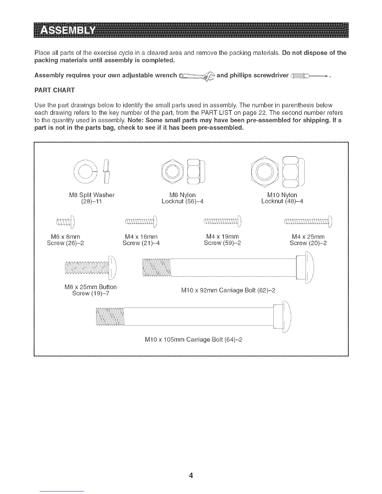 Hace aHparts of the exercise cycle in a cleared area and remove the packing materiaUs, Do not dispose of the