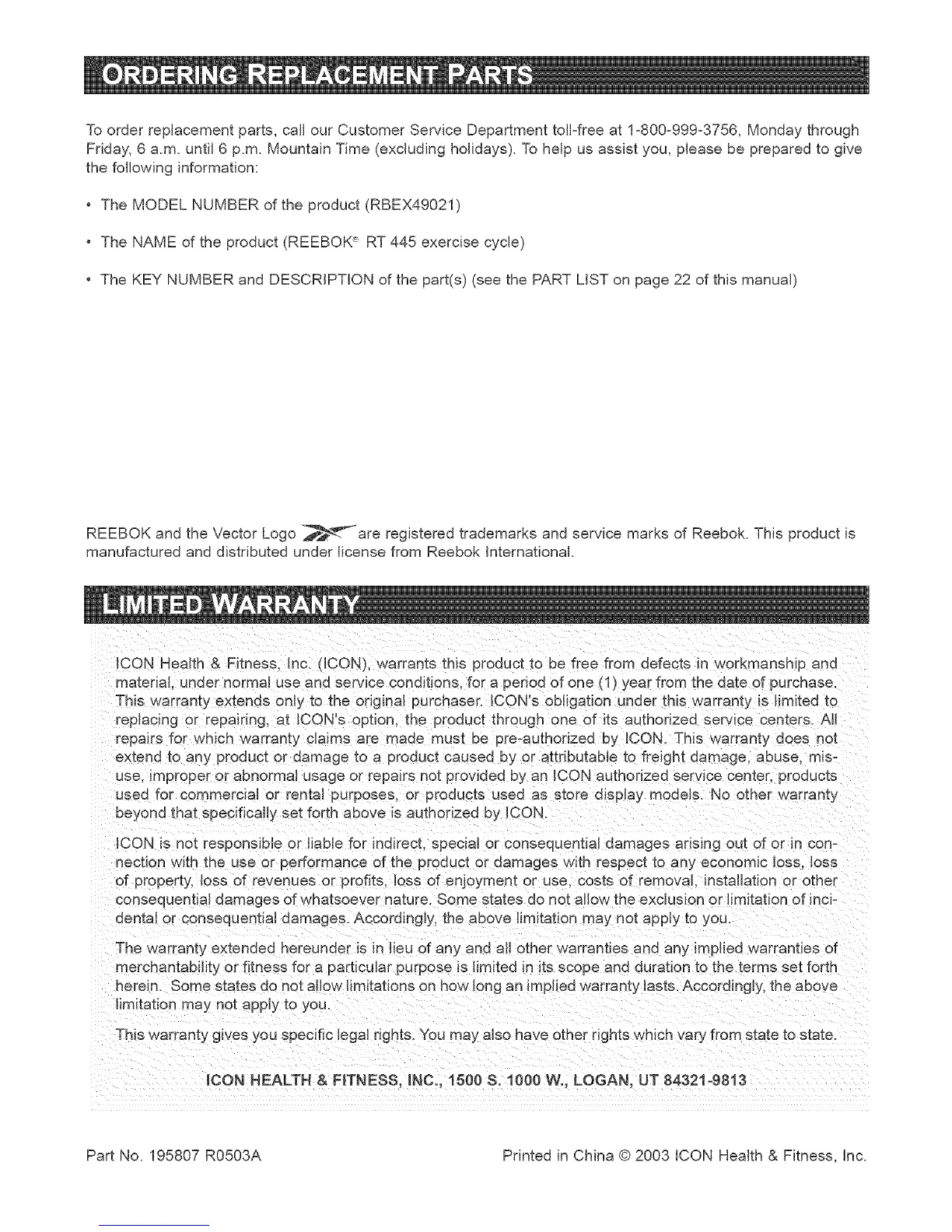 Part No. 195807 R0503A Printed in China @ 2003 ICON Health & Fitness, Inc.