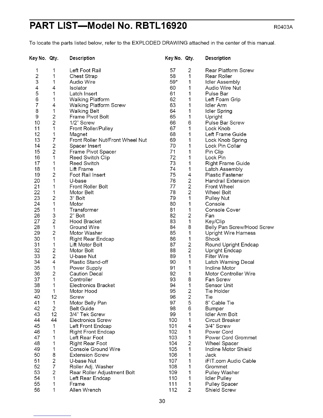 PART LIST--Model No. RBTL16920 R0403A