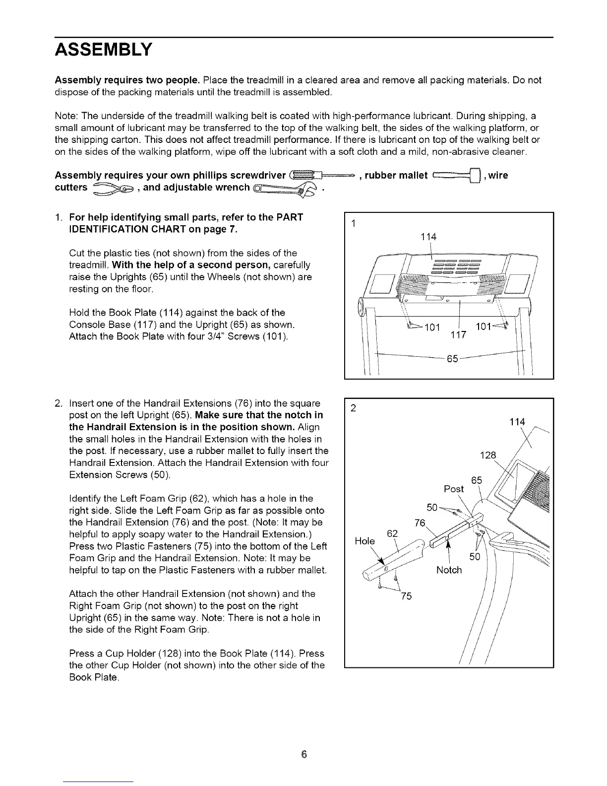 Assembly requires two people. Place the treadmill in a cleared area and remove all packing materials. Do not