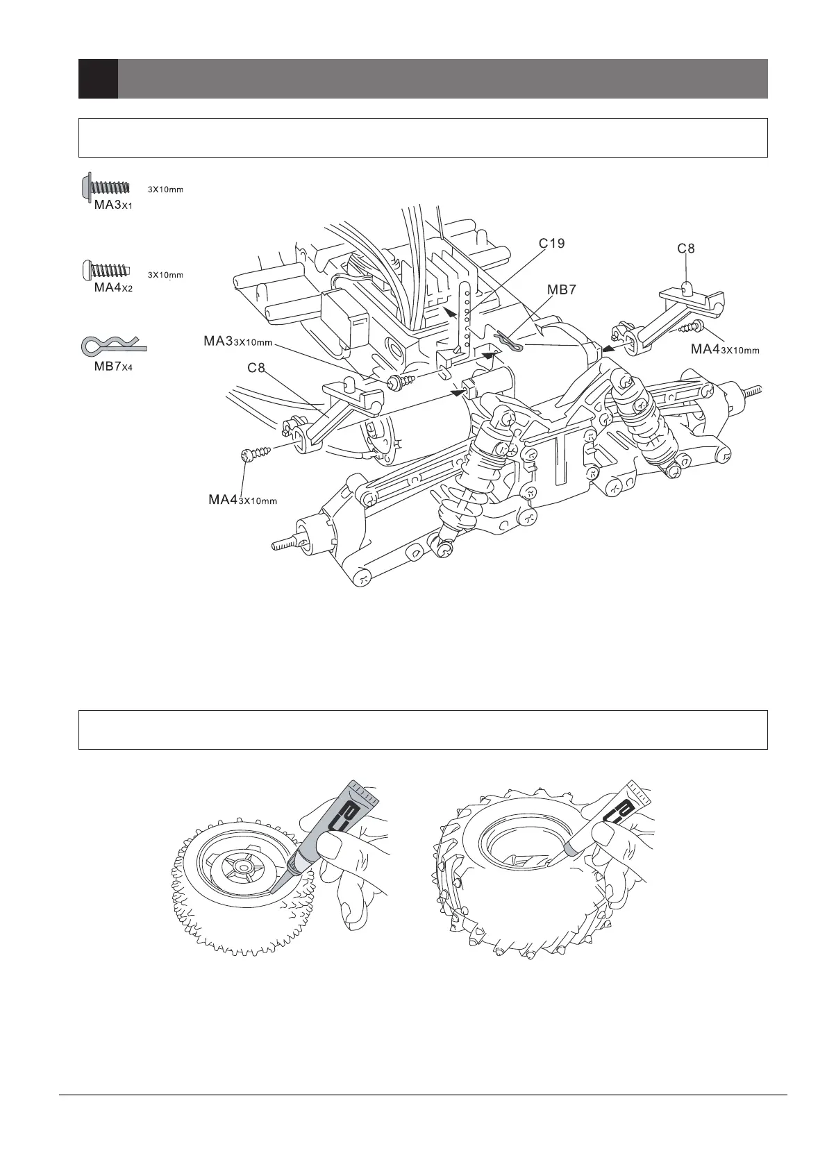 Reely CROSS-TIGER - Assembly Steps - Final Chassis and Wheel Assembly; Step 16: Chassis Holder and Spoiler (Sturdy); Step 17: Tyre and Wheel Gluing