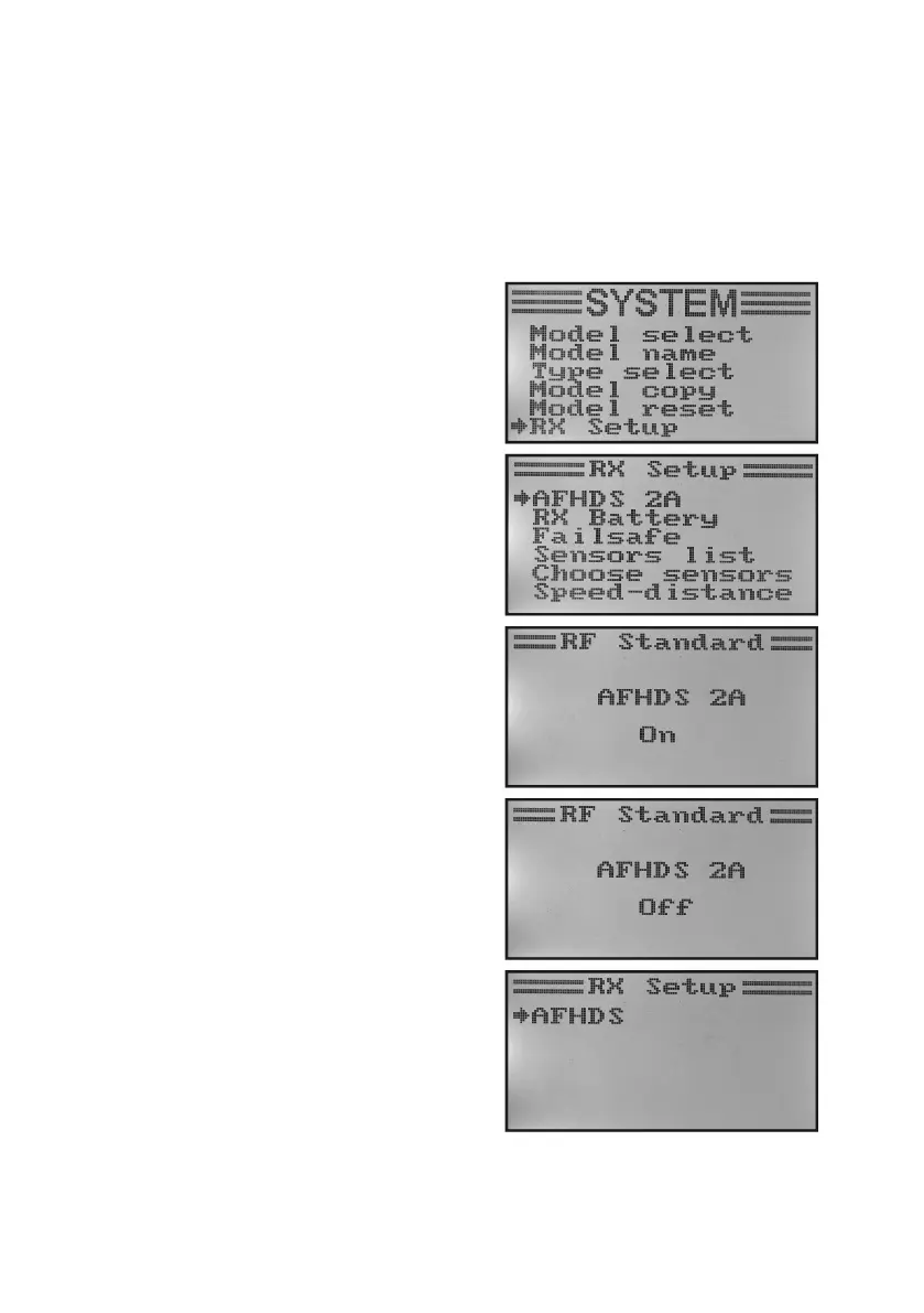 „AFHDS 2A“ will the menu „RX setup“ have all menu items