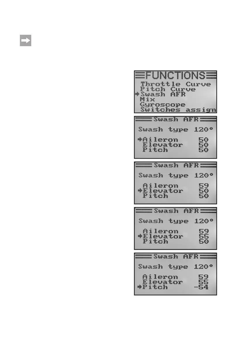In this menu, you can adjust the mixing ratio of the swash plate servos to each other. In this way you can perfectly