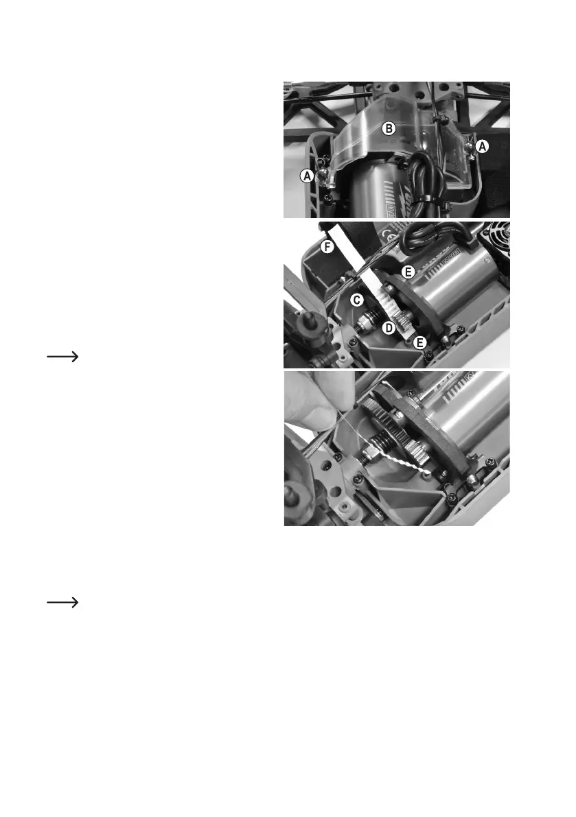 Draai nu in deze positie de bevestigingsschroeven (E) van de motor weer vast.