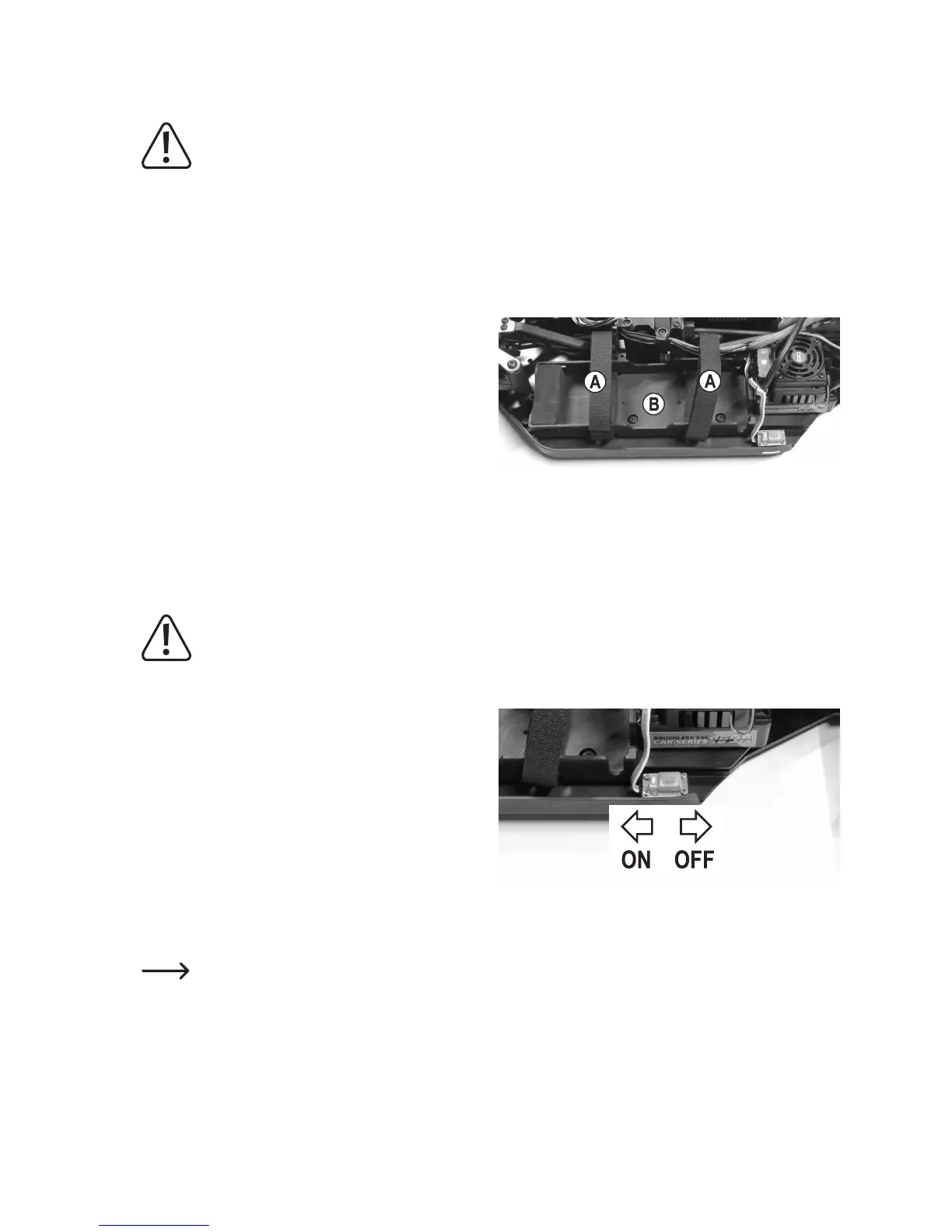 Do not connect the drive rechargeable batteries to the speed controller yet. First switch on the transmitter,