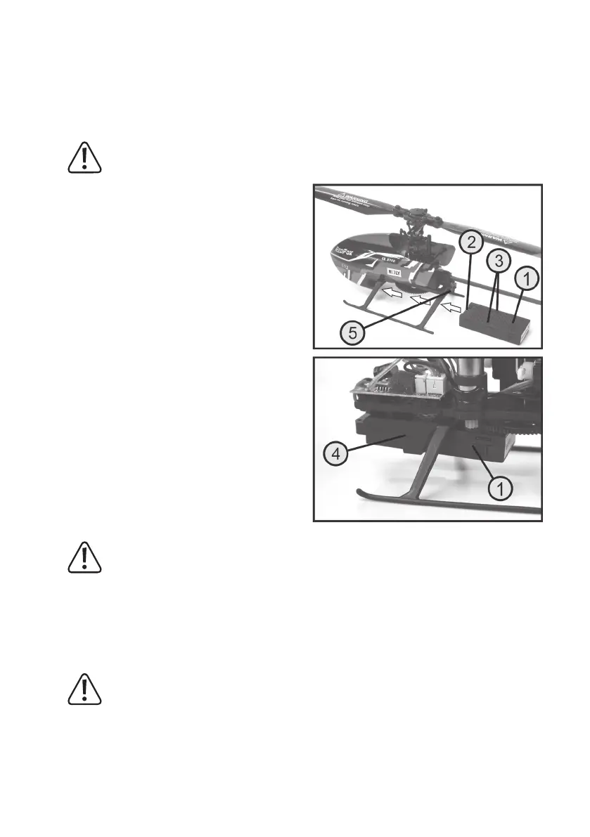 Aangezien de modelhelikopter geen schakelaar heeft, wordt het model bij het plaatsen van de accu direct van stroom