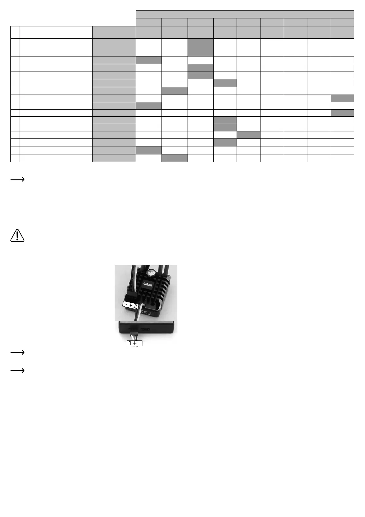 able battery type LiPo/NiMH, red LED ashes twice briey and the motor emits two short beeps), release