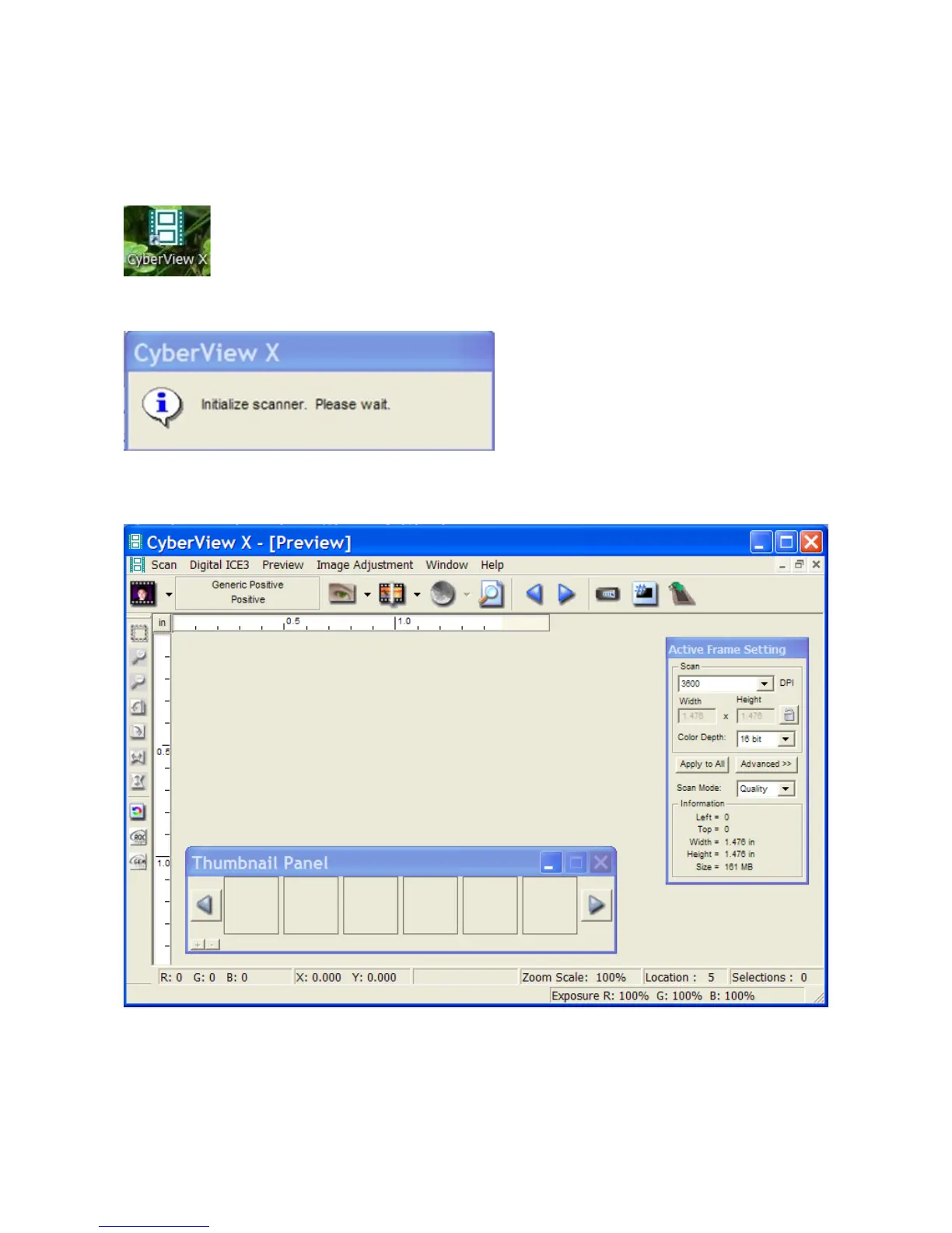 It takes about 3 minutes for the scanner to initialise, then the Cyberview Preview window appears
