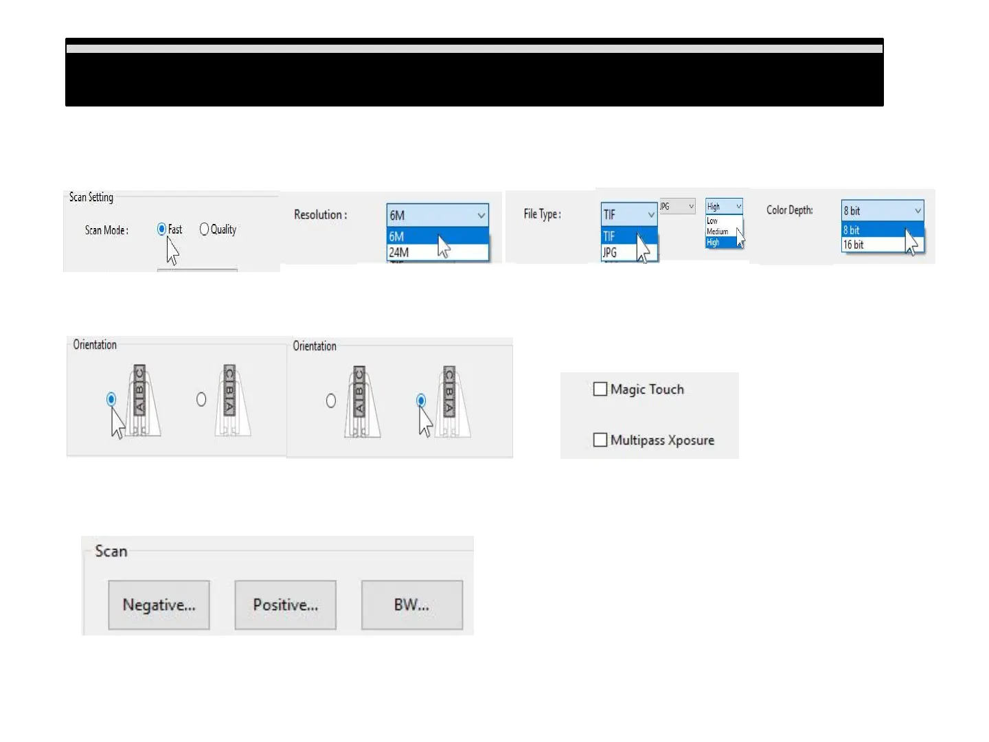 a. Scan Mode Fast or Quality, Resolution 6M or 24M, File type TIF or JPG, Color depth 8 or 16